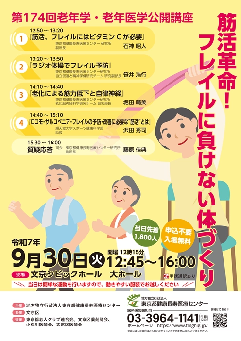 地方独立行政法人東京都健康長寿医療センターの主催事業として公開講座が定期的に開催されており、第154回(2019年5月29日(水)開催)および第166回(2023年9月29日(金)公開)には順大さくら“筋活”講座のメンバーでもある町田修一教授が登壇していました。そして、2025年9月30日に文京シビックホール 大ホールにて『第174回老年学・老年医学公開講座』が開催され、今回は私が講座の一つを担当いたしましたので、ご報告いたします。